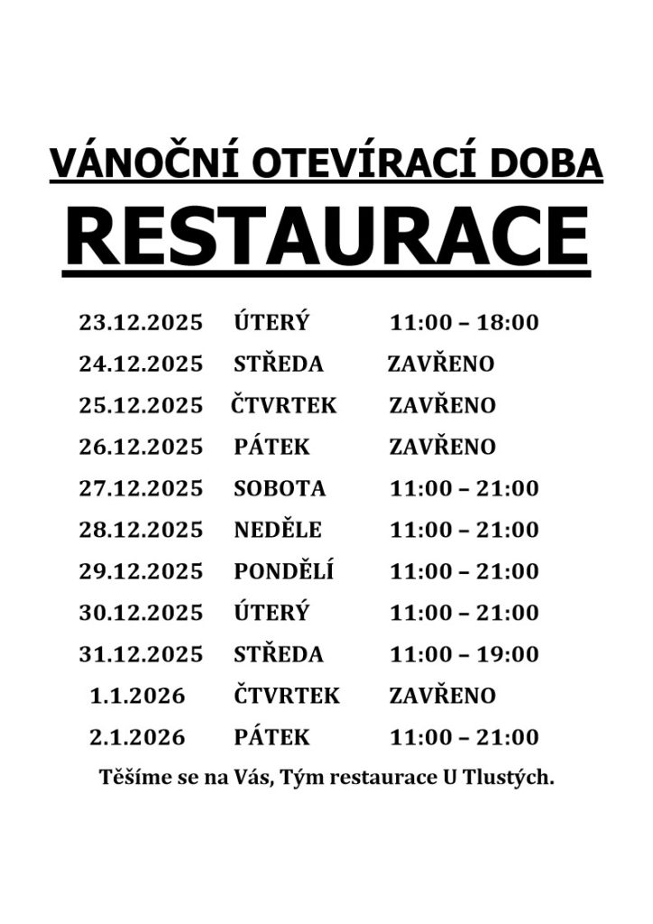 Rezervaci je nutné provést MINIMÁLNĚ 24 HODIN PŘED PLÁNOVANÝM TERMÍNEM NÁVŠTĚVY. Elektronické rezervace jsou vyřizovány pouze od pondělí do pátku. Rezervace se stává závaznou až v momentě potvrzení ze strany personálu restaurace U Tlustých (telefonicky, e-mailem). Z provozních důvodů je pro účely rezervace vymezen pouze určitý počet stolů. Do vnitřních prostor restaurace není povolen vstup se psy.